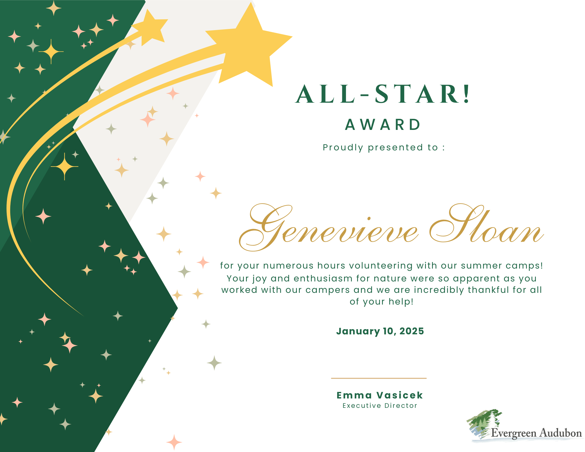 The “All-Star Award” was presented to Genevieve Sloan for her numerous hours volunteering with our summer camps! Her joy and enthusiasm for nature is so apparent as she worked with our campers and we are incredibly thankful for all her help!