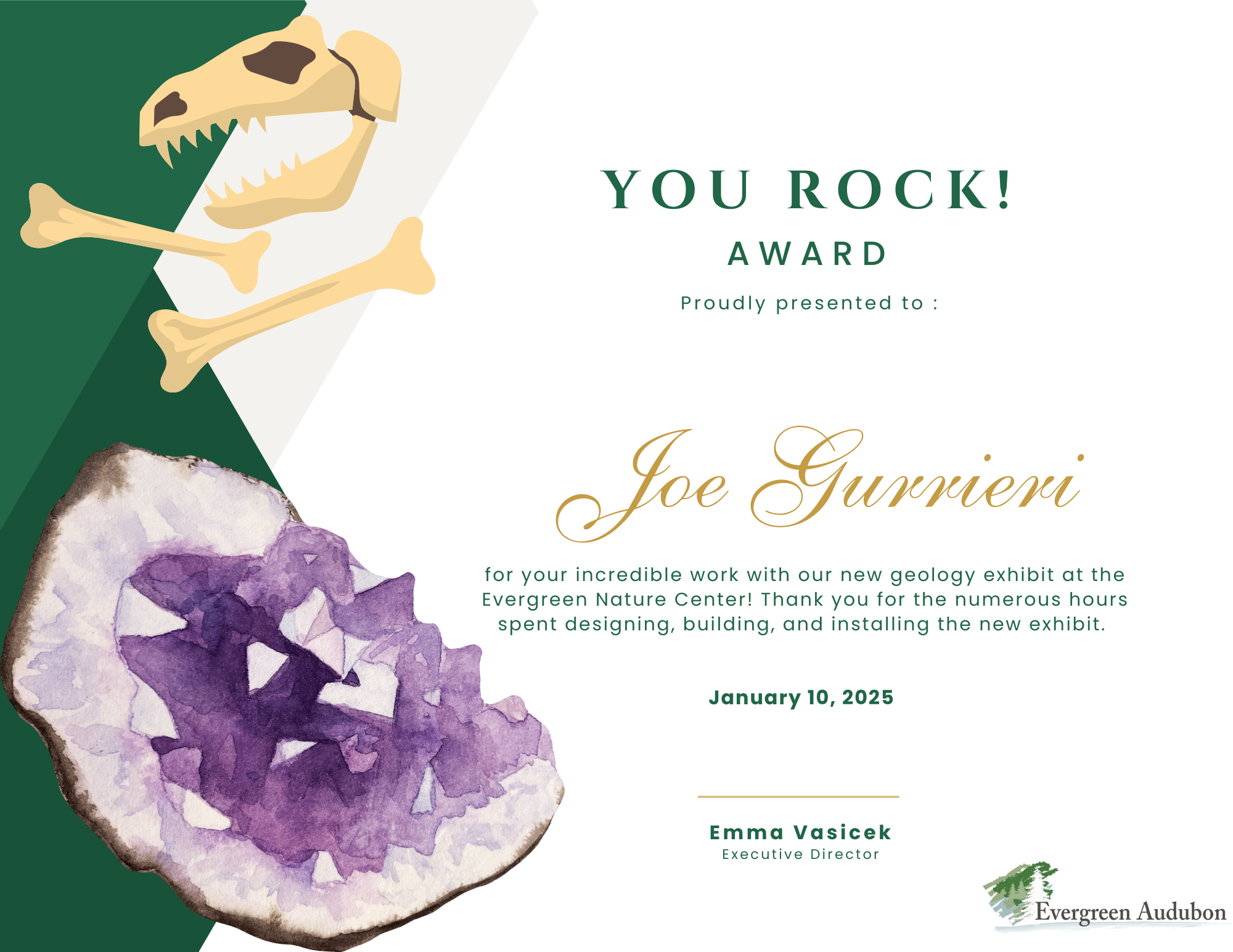 The “You Rock! Award” was presented to Joe Gurrieri for his incredible work with our new geology exhibit at the Evergreen Nature Center! Thank you for the numerous hours spent designing, building, and installing the new exhibit.