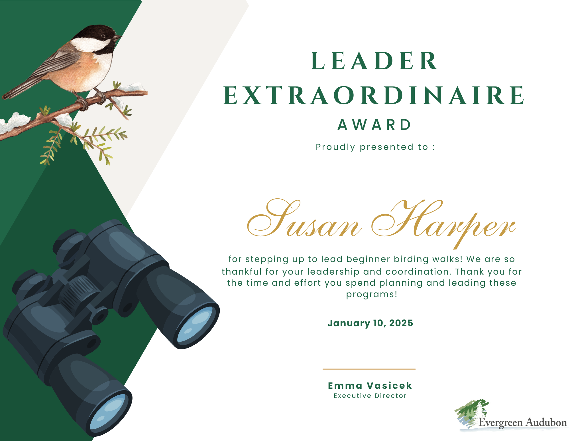 The “Leader Extraordinaire Award” was presented to Susan Harper for stepping up to lead beginner birding walks! We are so thankful for your leadership and coordination. Thank you for the time and effort you spend planning and leading these programs!