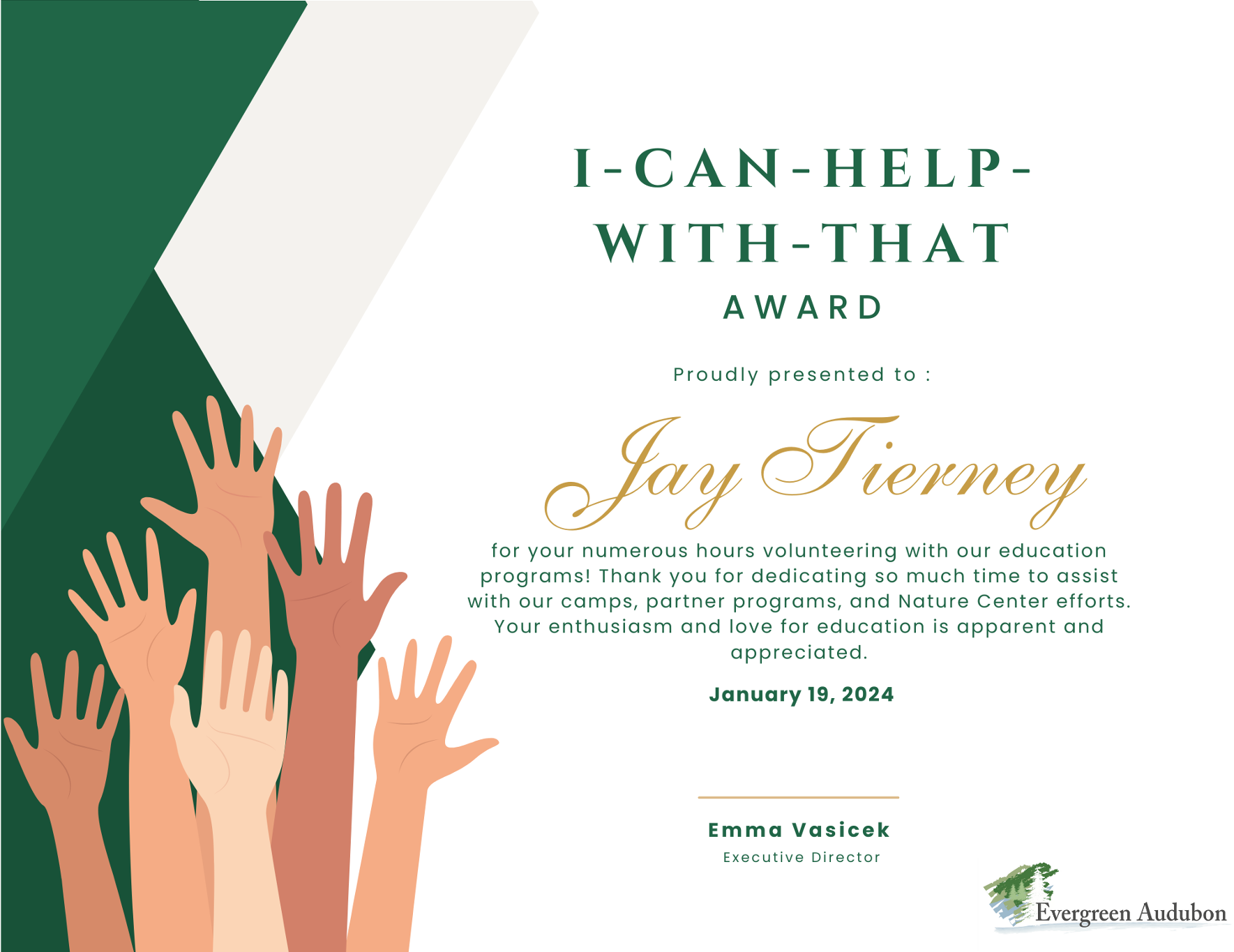 “I-Can-Help-With-That Award” was presented to Jay Tierney for his numerous hours volunteering with our education programs! Thank you for dedicating so much time to assist with our camps, partner programs, and Nature Center efforts. Your enthusiasm and love for education is apparent and appreciated.