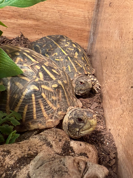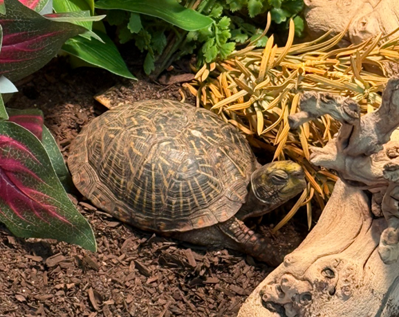I am so excited to share that Evergreen Nature Center is now home to three, beautiful Ornate Box Turtles! These lovely reptiles were adopted from the Colorado Reptile Humane Society on Friday, September 26, and have spent the past week settling into their new home. Ornate Box Turtles are Colorado’s only terrestrial turtle! They may look like tortoises, but these beautiful animals are actually part of the pond turtle family. They spend most of their time on land, but will often soak in shallow water. We will host a naming contest through October and November. I am thrilled to introduce you to our spunky new animal ambassadors!