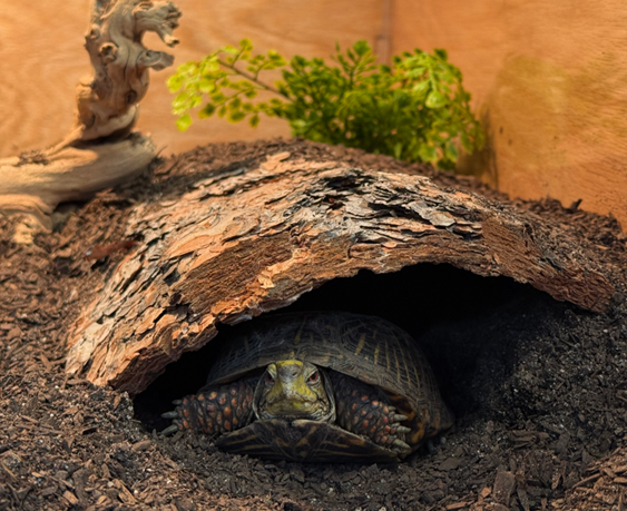 Our first introduction is for the smallest turtle, a male with bright orange legs and a yellow head. This handsome fella is the calmest of the three and seems thrilled by his new home. He spends most of his time snoozing under the heat lamp, eating food, and hiding under the bark (see photo to the left). His coloration makes him distinct from his companions, and his temperament is very docile.