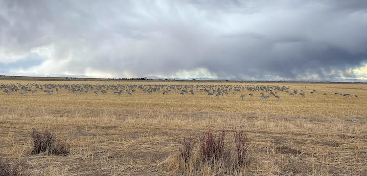 Several years ago we started the tradition of doing a “how many XYZ’s do you see in photo” guessing game. This year’s photo was of sandhill cranes. Barbara Klaus was the best guesser; she was closest to the actual count of 606. How many would you have guessed? (Click on the photo to enlarge it.)