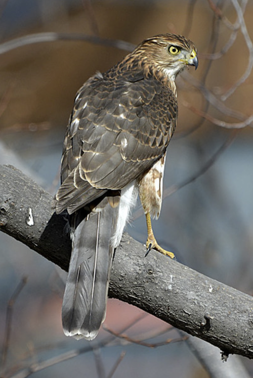 Then, there were the Cooper’s Hawks, the Red-tailed Hawks, and the Common Raven. So, first of all there’s the identification of these three species. Cooper’s Hawks are the mid-sized accipiters, being more slender and elongated than a buteo, and having the usual accipiter long, banded tail. More specifically, the head is flat on top and eye-placement is toward the front of the head giving them a more imperious look as opposed to the Sharp-shinned Hawk whose rounded head and more centered eye gives them a less fierce look – almost pigeon-like. Other features that we noted were that a first-year bird has orange eyes (transitioning from yellow to red), that Coops have a fairly distinctive “kik” call, and that both sexes perform a courtship flight display in which the bright white undertail coverts are flared laterally. Red-tails, in comparison with other buteos, tend to have more rounded wing tips and “bulging” secondary flight feathers that make the wings look quite broad. And Common Ravens are distinguished by, among other things, their wedge-shaped tails. We got to witness some interesting aerial interactions between these three species, most likely related to the hawks starting to incubate eggs. Our job as observers was to try and figure out who was chasing whom, and oftentimes the roles seemed to reverse – Red-tail chasing Raven, Raven chasing Red-tail, Coop chasing Red-tail, etc.