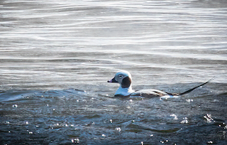 We then went upstream to a site at the junction of 74th street and the South Platte. At this site, surface foams in turbulent sections indicating more direct influence of upstream wastewater. Regardless, waterfowl were well represented. In particular, Buffleheads and Common Goldeneyes were in abundance. Our real excitement was reserved for the possible presence of a Long-Tailed Duck, a sea duck rarely found inland. One had been previously observed at this site, but there’s no guarantee of seeing a single rare species like the Long-Tailed Duck on any given day. However, we were fortunate to find this bird, although it moved rapidly downstream shortly after being observed, making detailed looks challenging. However, the striking winter plumage of this male bird made confirming its ID easy.
