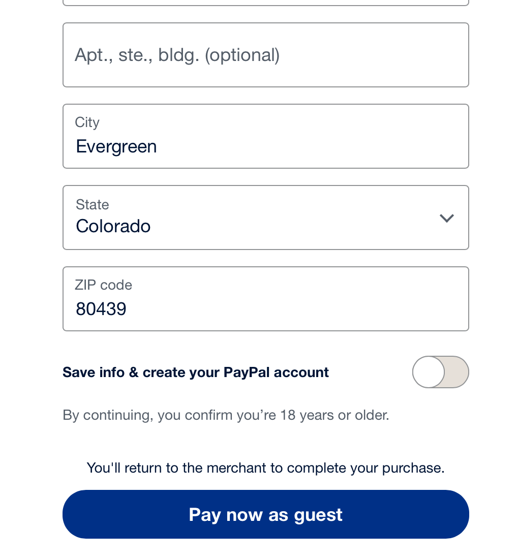 3. After entering your card number and billing information, UNSELECT Save info & create your PalPal account – then select Pay Now as a guest.